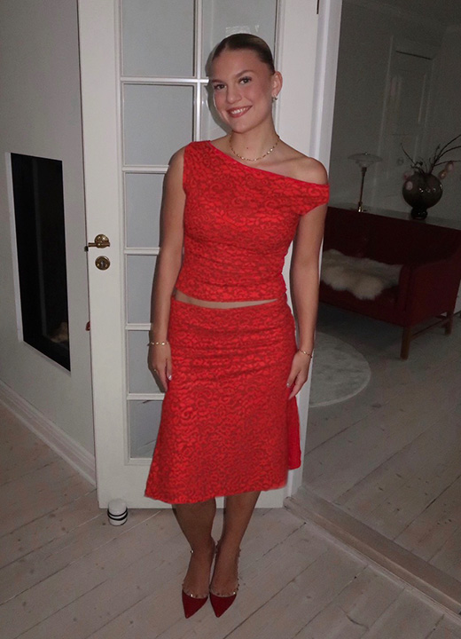 Et feminint og iøjnefaldende sæt, der balancerer elegance med et moderne udtryk. Toppen har et smukt off-shoulder snit, som fremhæver skuldrene og giver et let, sofistikeret look. Den sidder tæt og følger kroppens form, mens nederdelen falder glat og skaber en harmonisk silhuet fra talje til knæ. Det fine blondemateriale tilfører sættet en eksklusiv struktur og et levende touch.