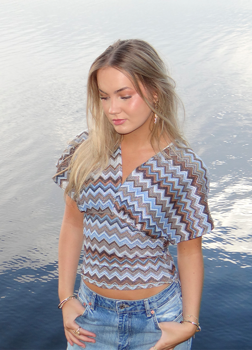 En stilren top, som giver liv til outfittet. Med flotte farver og en glitrende tråd, er toppen perfekt til alle anledninger. Top har en v-udskæring foran og bagpå, men med en lille syning foran, så man føler sig tilpas i den.