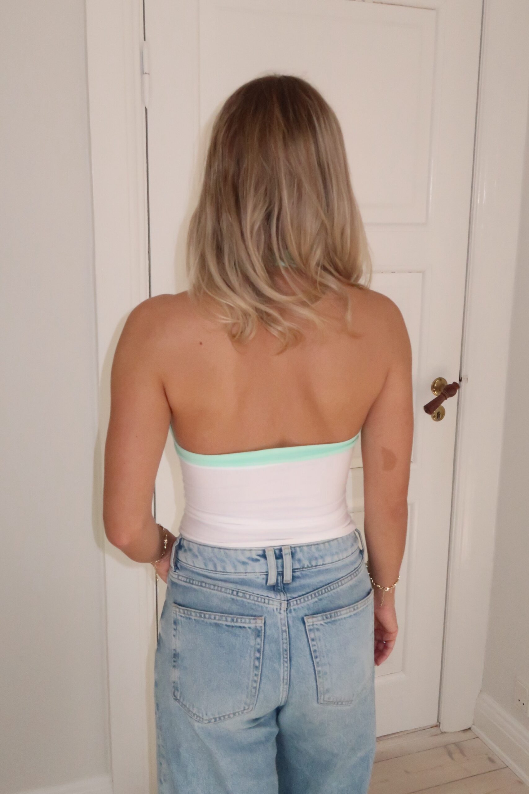 Et feminint og moderne sæt, der forener et rent design med et legende udtryk. Toppen har et flatterende halterneck snit, som fremhæver skuldre og kraveben og giver et elegant, let look. Den sidder tæt til kroppen og skaber en smuk, strømlinet silhuet, mens nederdelen falder enkelt og harmonisk fra taljen og ned.